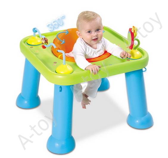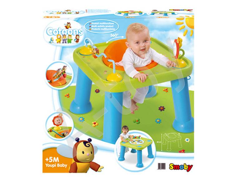 Большой игровой безопасный столик с вращающимся удобным сиденьем для малышей, которые только научились сидеть и удобный игровой стол для деток постарше. Сиденье для малюток вращается на 360 градусов, что позволяет даже самым маленьким дотянуться до понравившихся игрушек, и при этом гарантированно не упасть и не выйти из-за столика. В дальнейшем столик послужит удобным местом для игр, рисования или лепки. Для малышей на столике устанавливаются игрушки на присосках: пчелка Зум (движется по дорожке) и львенок Тюлип с зеркалом. Столик-трансформер легко собирается и разбирается, в центре столешницы — специальное отверстие для размещения регулируемого креслица малыша. В дальнейшем отверстие закрывается крышечкой с изображением героев серии Cotoons.