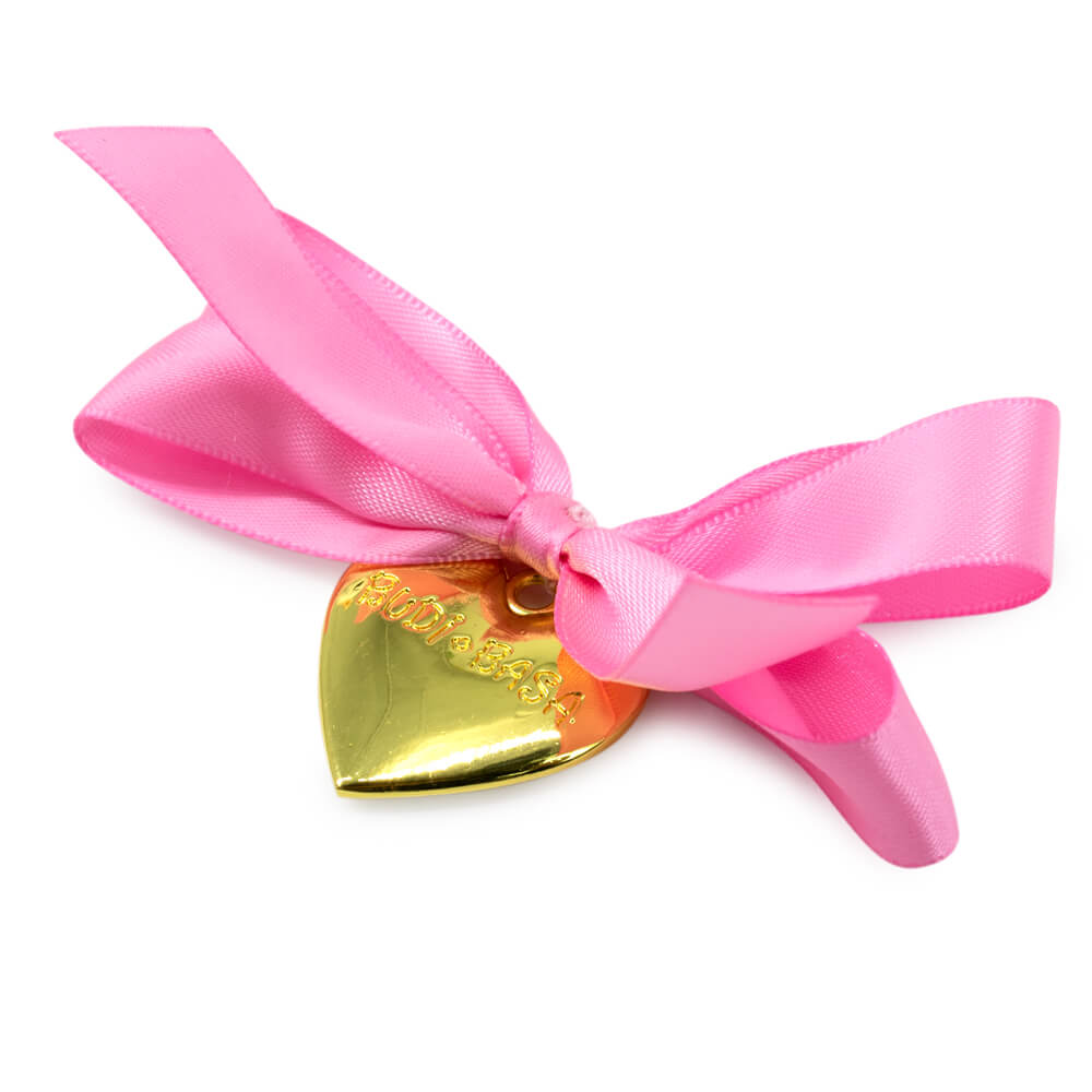 На Лиличке красивый бант ручной работы из атласной ленты цвета розовой сладкой ваты. В середине бант украшает сердечко из металла цвета античного золота. На сердечке выдавлен маленький след кошачьей лапки.