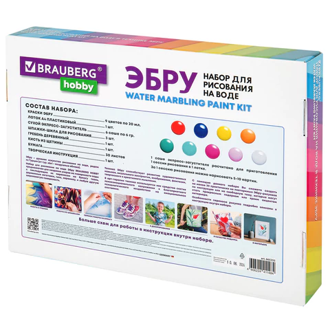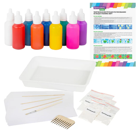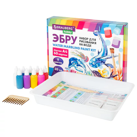 Набор для рисования на воде ЭБРУ от BRAUBERG HOBBY — это древнее турецкое искусство создания уникальных орнаментов на поверхности воды с последующим переносом на бумагу. Каждый рисунок получается единственным в своем роде — повторить его невозможно даже вам самим!