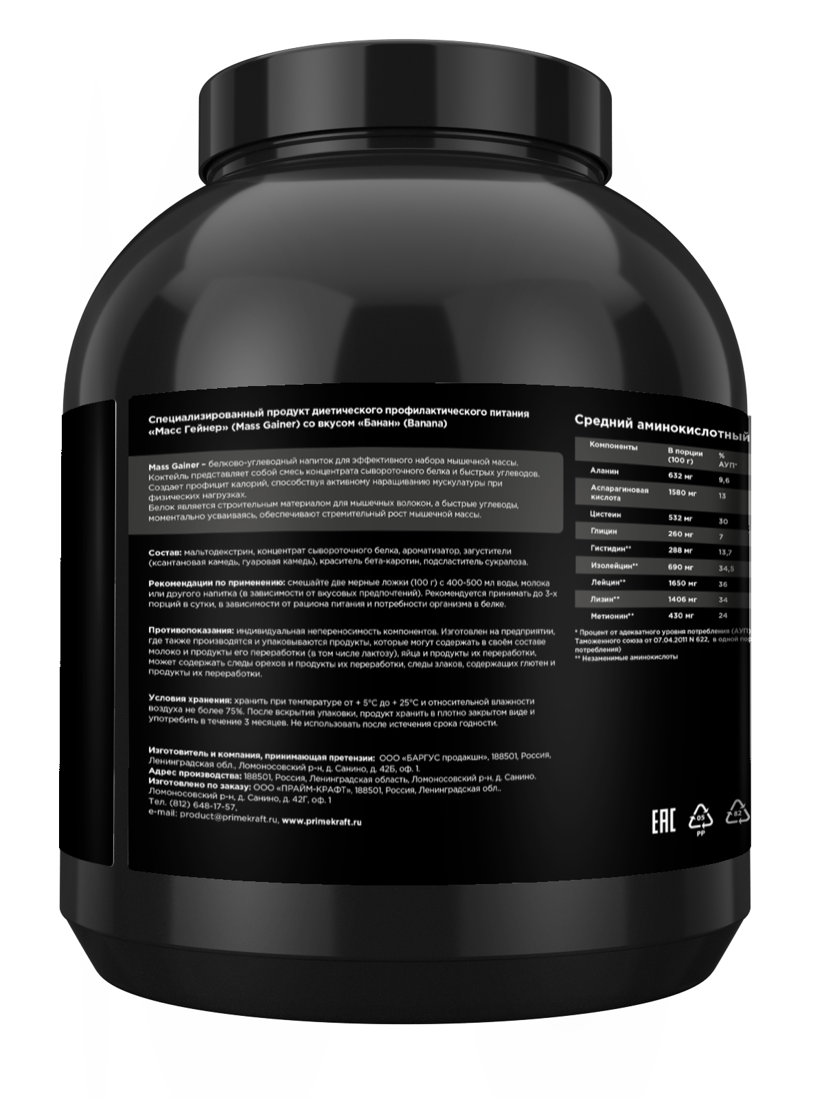 Гейнер белково-углеводный PRIMEKRAFT/ MASS GAINER для набора массы со вкусом «Банан», 3 кг, банка
