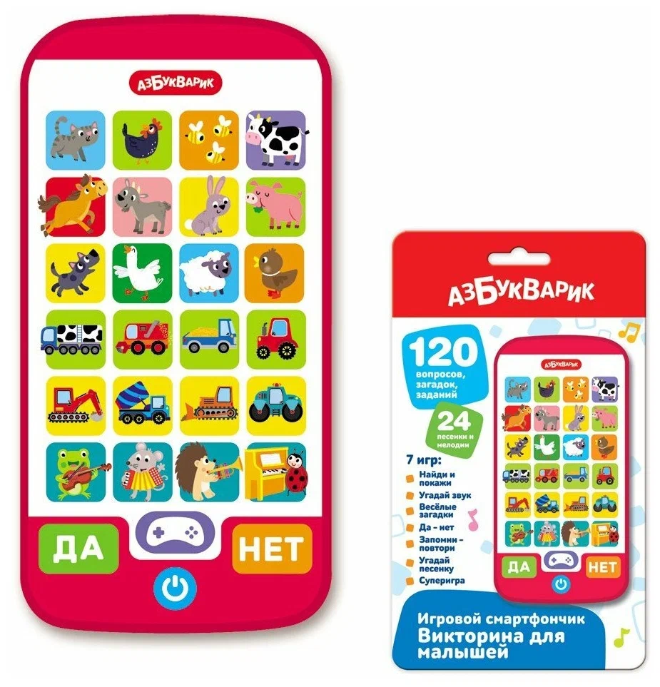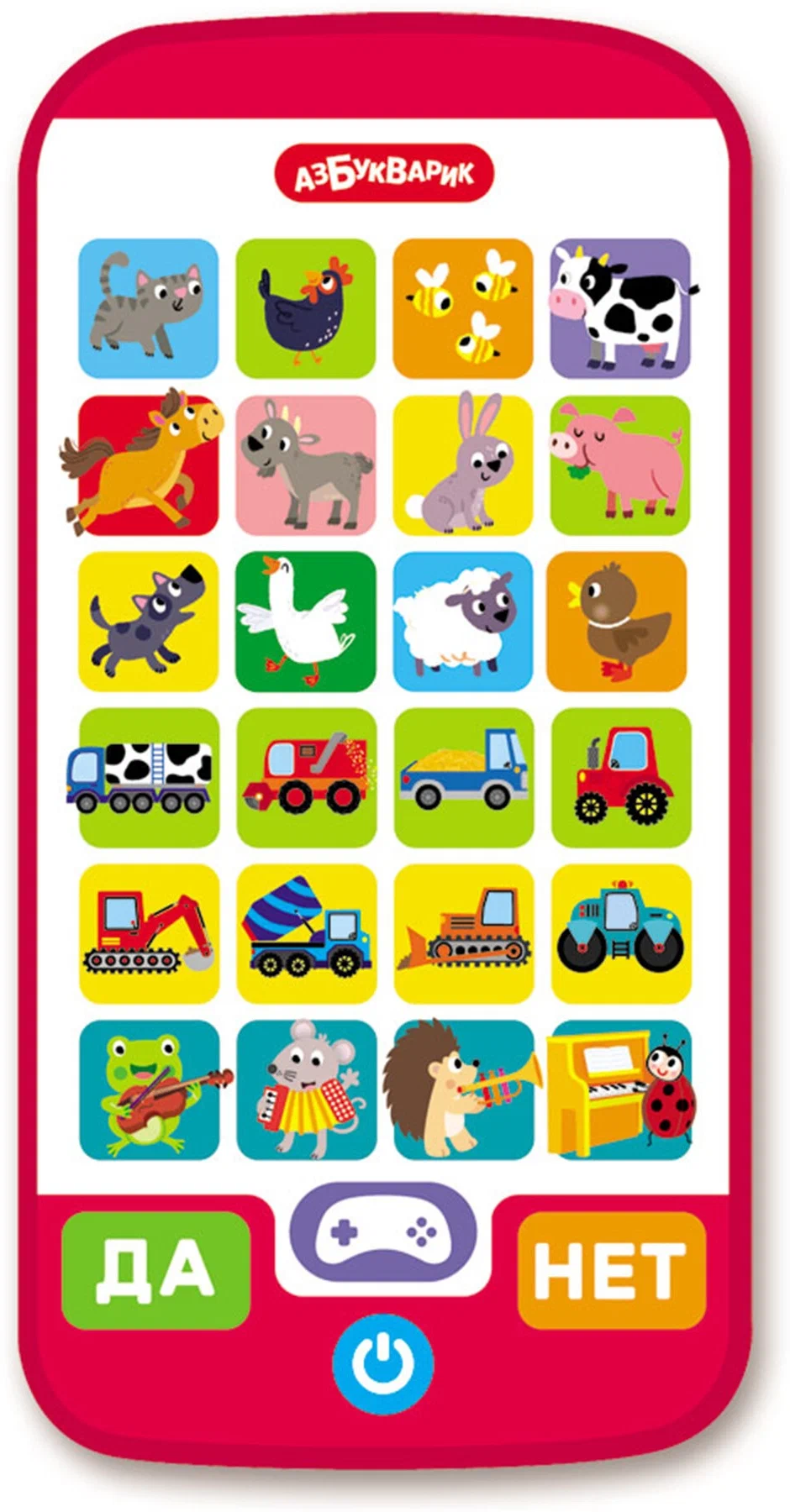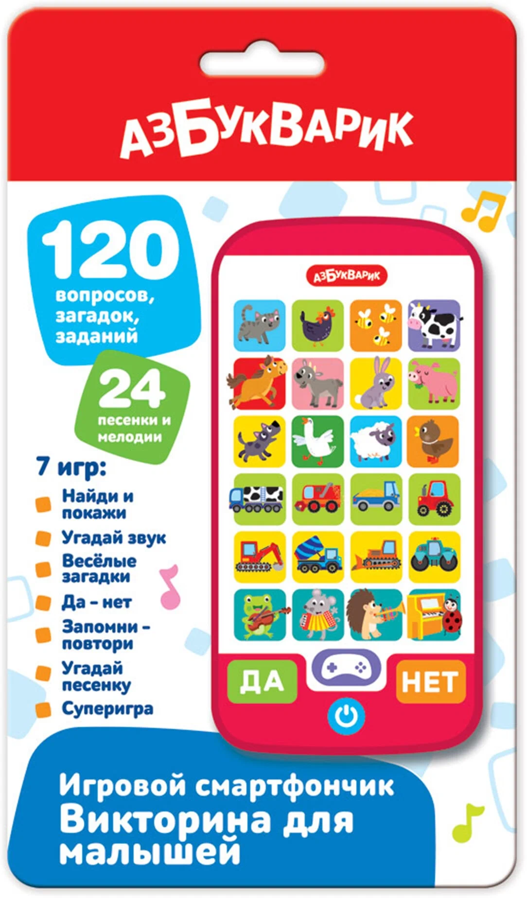 Игровой смартфончик Викторина для малышей надолго займет неугомонного непоседу. Крохе нравятся забавные кнопочки с картинками, веселые задания и яркое оформление телефона.