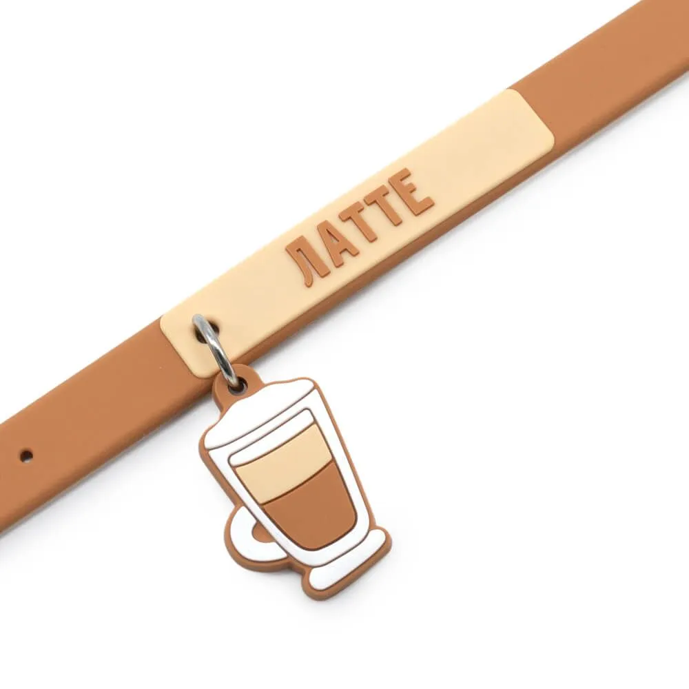 На шейке у кота силиконовый чокер с названием и небольшим подвесом в виде стаканчика с кофе латте.