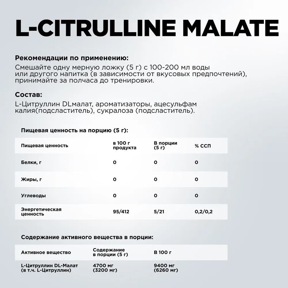 Состав: L-Цитруллин DL малат, ароматизатор «Кола», ацесульфам калия (подсластитель), ароматизатор «Ваниль», сукралоза (подсластитель).