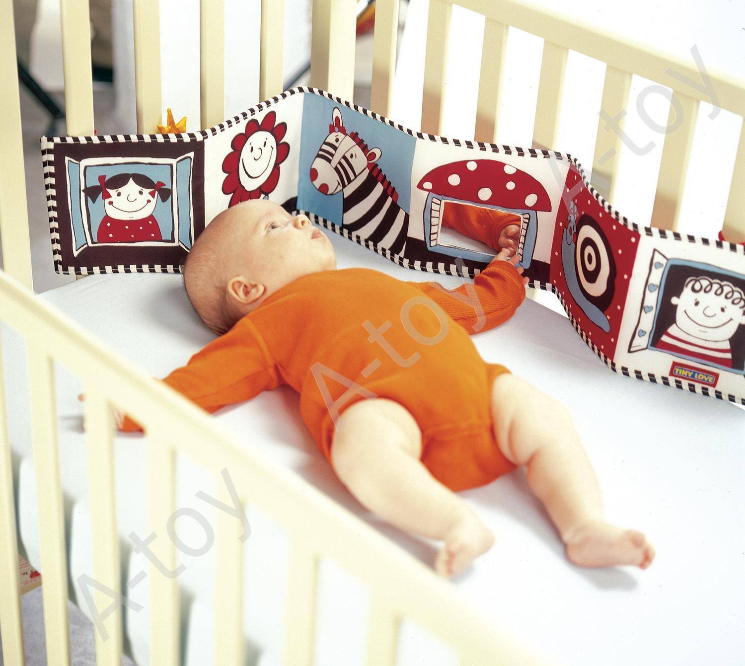 Книжка крепится с помощью завязок к кроватке или коляске вместо бортика.