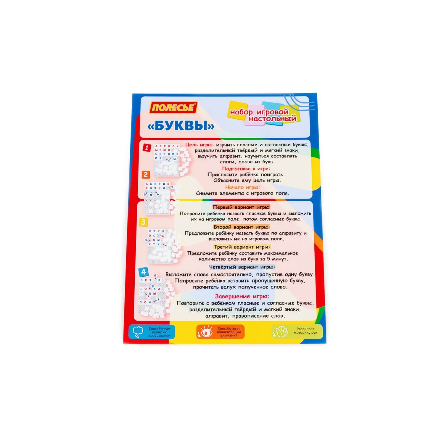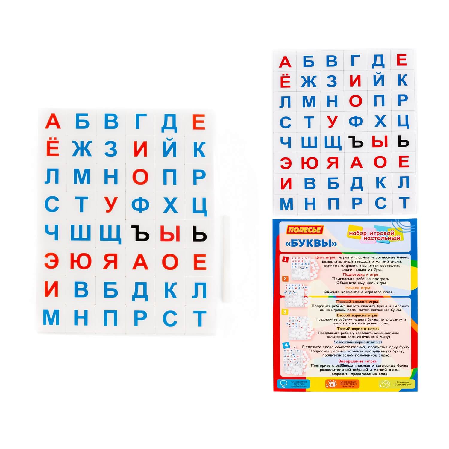 Настольная игра "Буквы" способствует развитию логического мышления, улучшает моторику рук, а также тренирует концентрацию внимания и память.