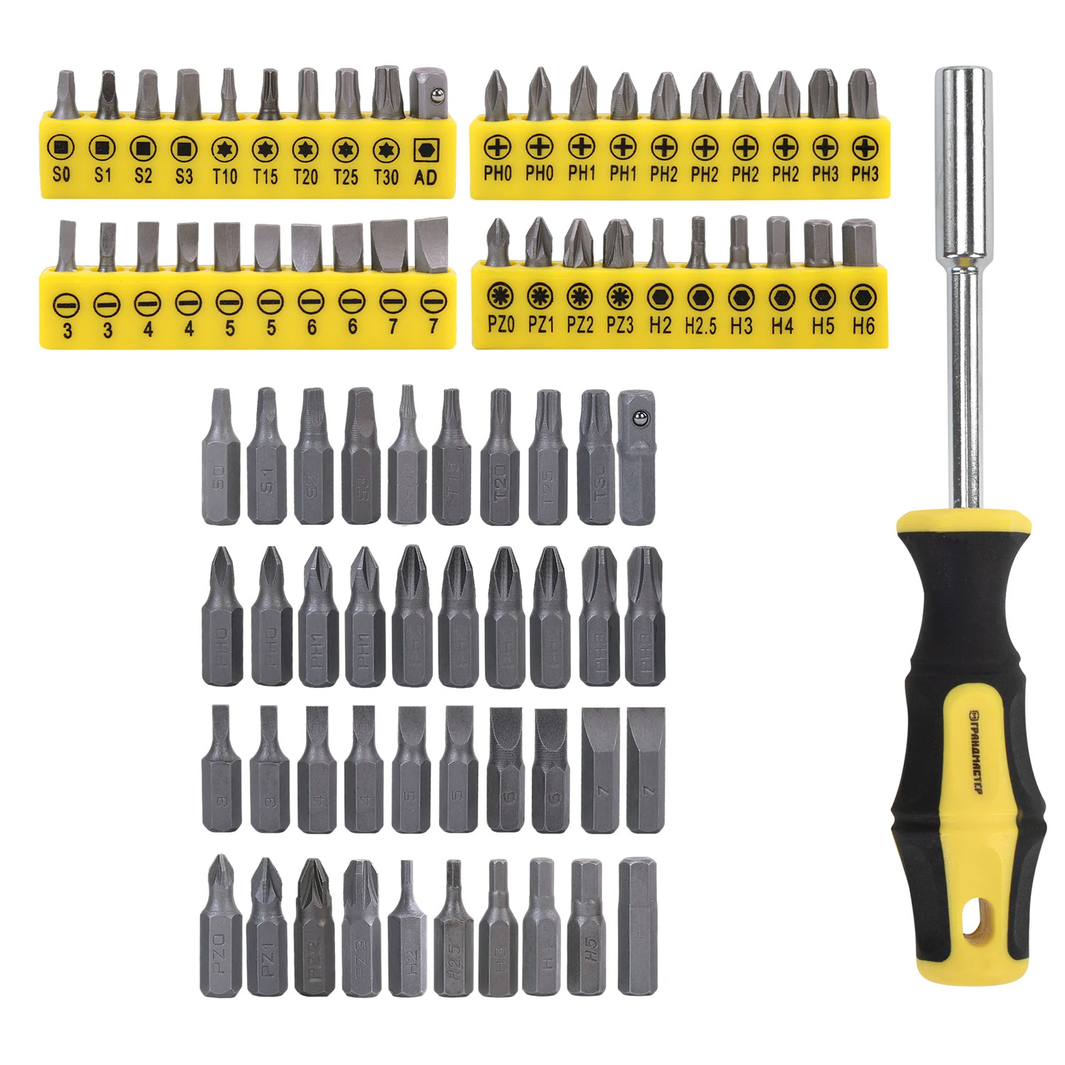Набор отверток и бит: Все типы насадок (SL, PH, PZ, Torx, Hex) в держателе.