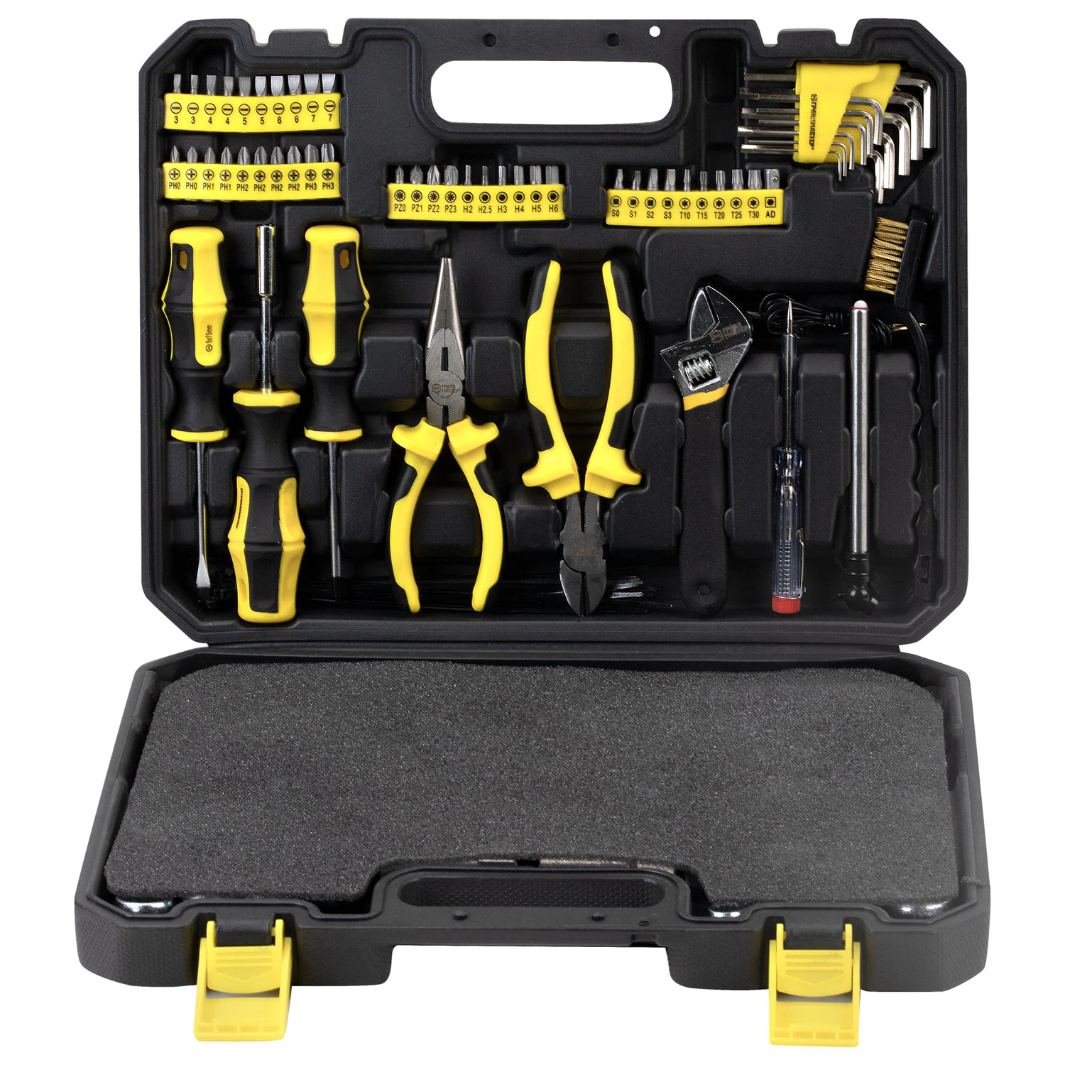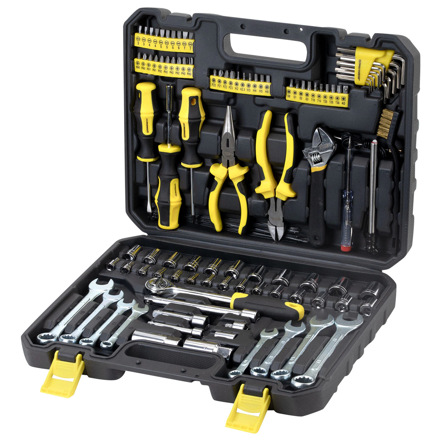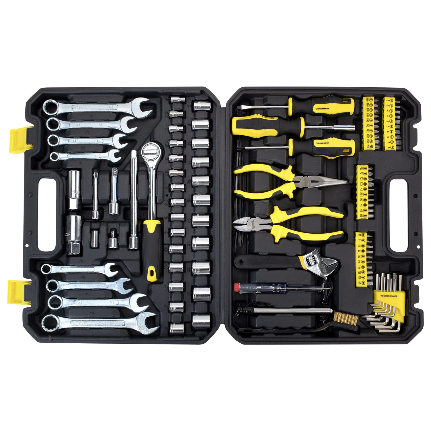 Весь инструмент чётко организован в прочном и вместительном пластиковом кейсе-чемодане с прозрачной крышкой. Каждый предмет имеет своё место, что гарантирует порядок, мгновенный поиск нужной детали и защиту от потерь.