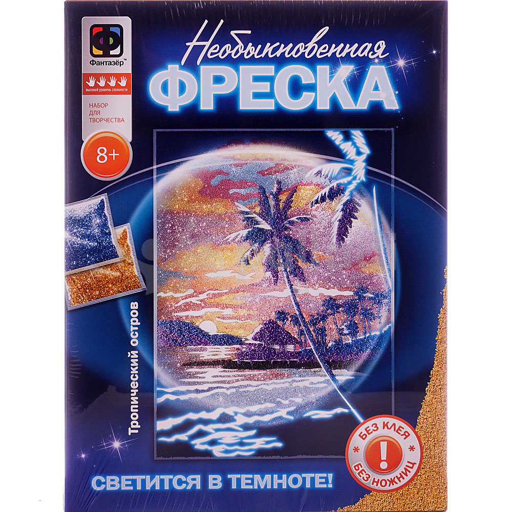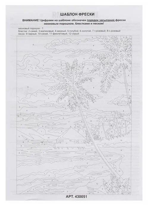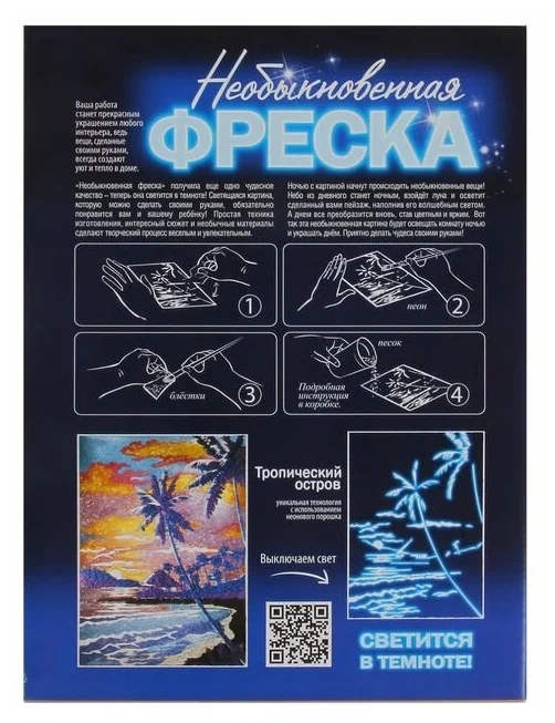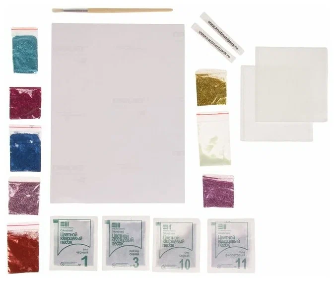 В наборе: основа с высеченным трафаретом, набор цветного песка, фотолюминофор, заготовка рамки, стек, кисточка, бумажная салфетка, подробная инструкция.
