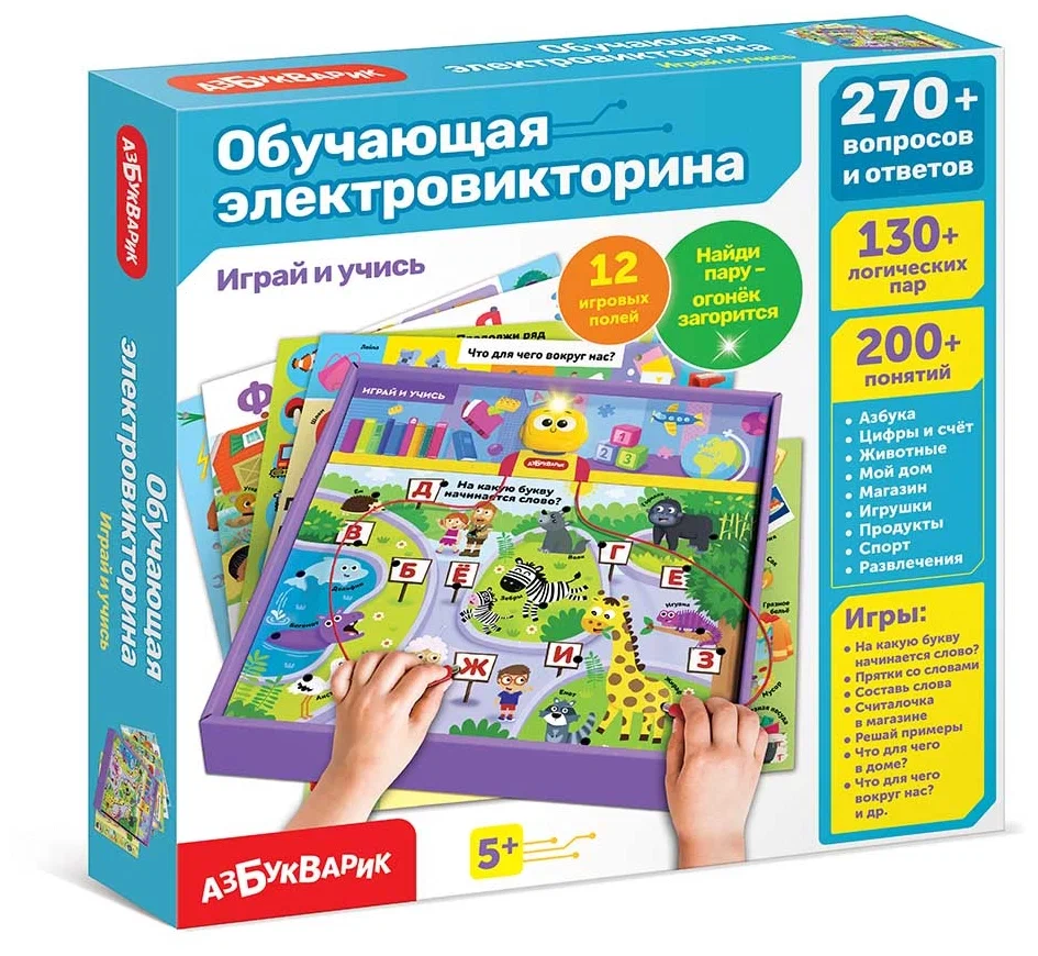 Обучающая электровикторина «Играй и учись» – увлекательная интерактивная игра, с которой ребенок выучит буквы, цифры и многое другое. Суть этой игры – в исследовательском подходе: ребенок будет сам подбирать логические пары на каждой карточке, соединяя их проводками электронного модуля.