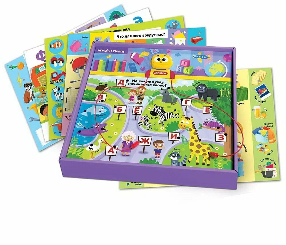 В игровой набор входят 12 игровых полей (это 6 двусторонних карточек), плата, электронный модуль в виде робота и инструкция. Играя с карточками, ребенок изучит более 200 понятий по разным темам (азбука, цифры и счет, животные, мой дом, магазин, игрушки, продукты, спорт, развлечения) и подберет более 130 логических пар. На каждой стороне карточки представлена оригинальная тематическая игра: «На какую букву начинается слово?», «Составь слова», «Считалочка в магазине», «Решай примеры», «Что для чего в доме?», «Что для чего вокруг нас?» и др.