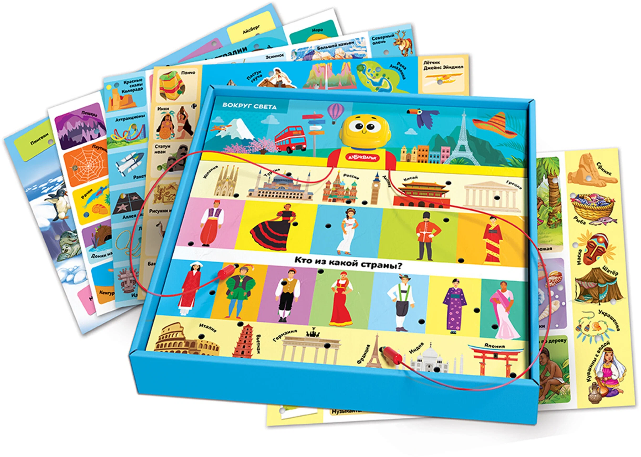 В игровой набор входят 12 игровых полей (это 6 двусторонних карточек), плата, электронный модуль в виде робота и инструкция. Играя с карточками, ребенок изучит более 200 понятий по разным темам (континенты, страны, народы, обычаи, культура, архитектура, достопримечательности, животные, природа) и подберет более 130 логических пар. На каждой стороне карточки представлена оригинальная тематическая игра: «Кто из какой страны?», «Чем знаменита Южная Америка», «Как живут в Африке», «Животные на карте Евразии» и др.