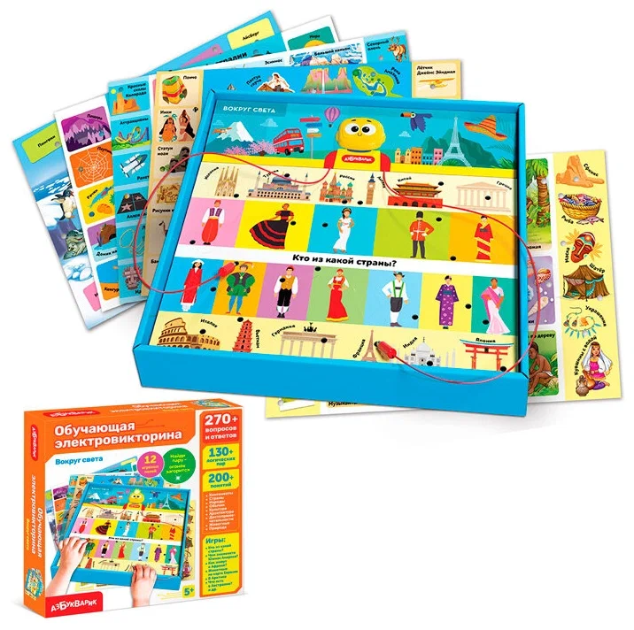 Обучающая электровикторина «Вокруг света» – увлекательная интерактивная игра, с которой ребенок получит новые знания о разных странах и континентах. Суть этой игры – в исследовательском подходе: ребенок будет сам подбирать логические пары на каждой карточке, соединяя их проводками электронного модуля.