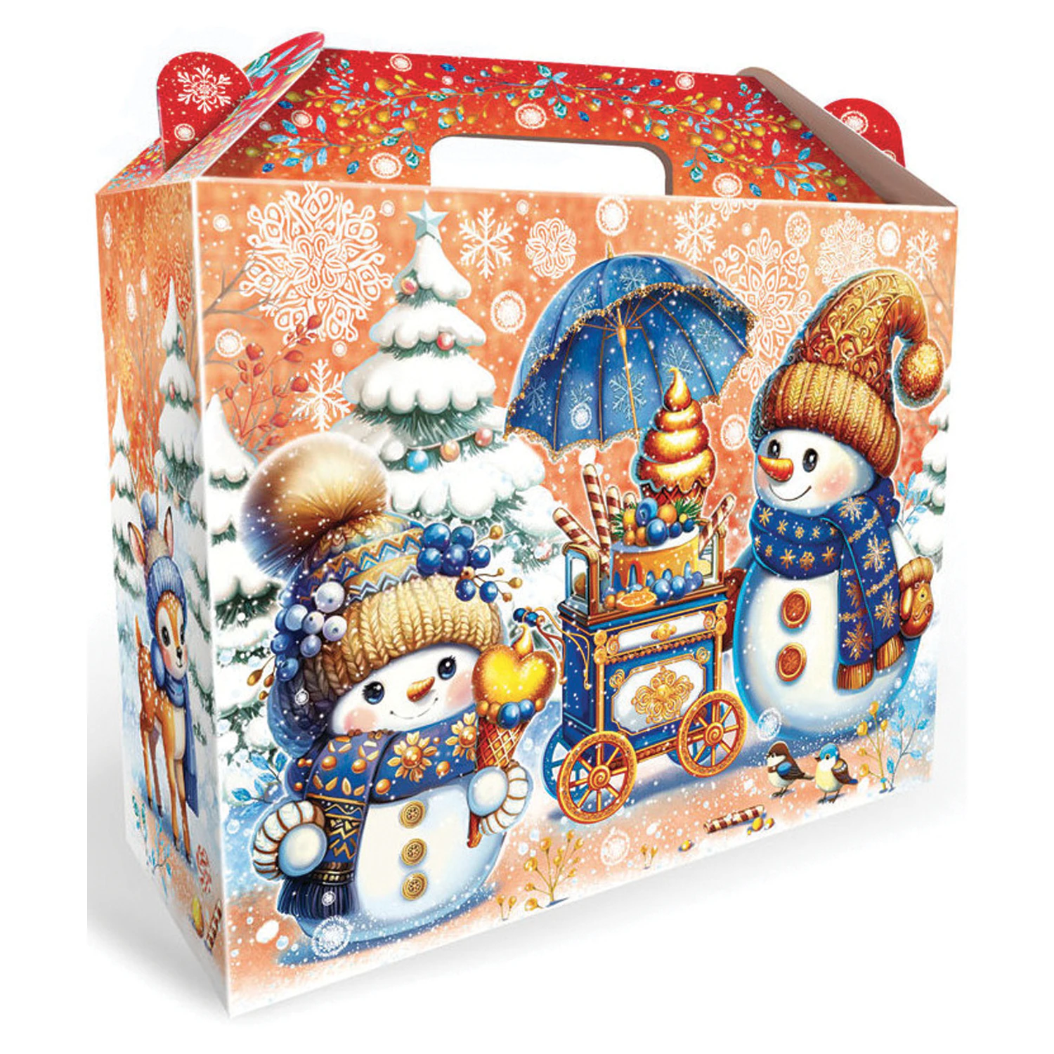Упаковка: Картонная коробка в форме чемоданчика. Обычно она ярко оформлена в новогодней или рождественской тематике (с изображениями Деда Мороза, Снегурочки, снежинок, зимних пейзажей). Часто имеет удобную ручку для переноски.