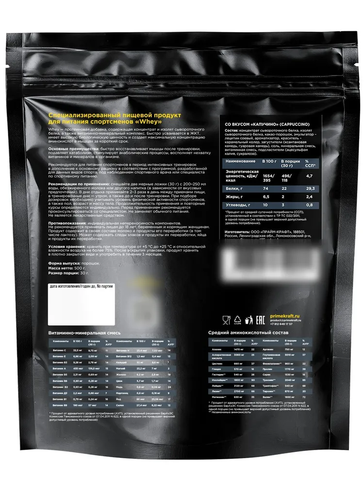 Протеин сывороточный PRIMEKRAFT "Whey Protein" с витаминами и минералами, Капучино 500 г