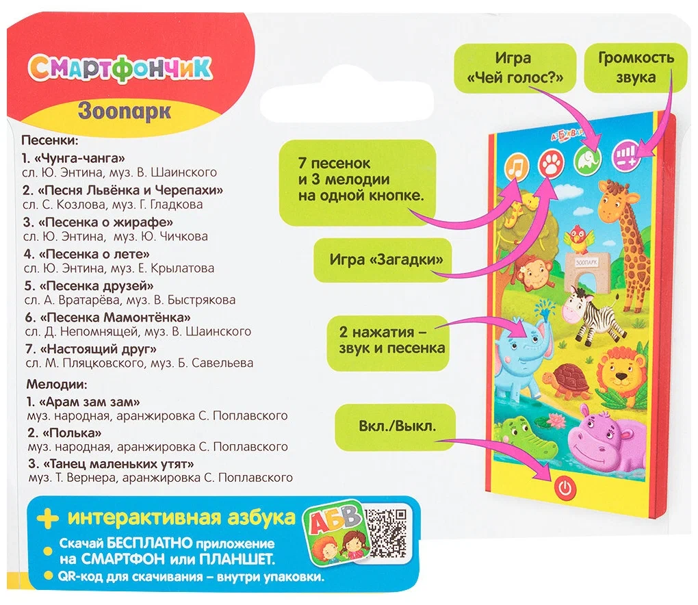 На детском смартфоне записано 10 песенок и голосов зверят, а также 7 песенок-мультяшек.